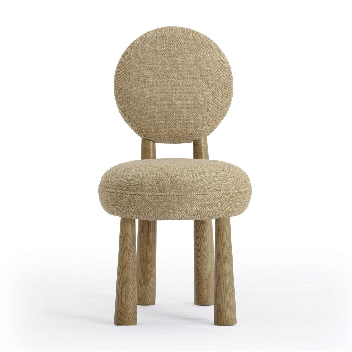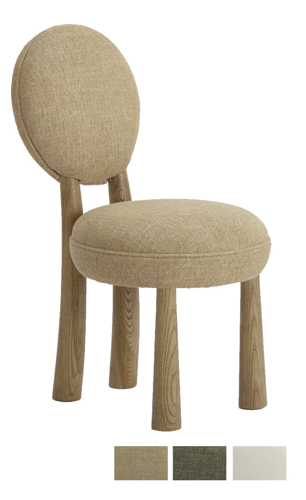 Balancing sculptural form with timeless craftsmanship, this dining chair features a distinctive circular back paired with elegantly flared ash wood legs. The rounded silhouette lends a sense of softness and refinement, while the natural wood base grounds the design with warmth and durability. Equally striking at the dining table or styled on its own, it’s a piece that blends vintage inspiration with modern ease.