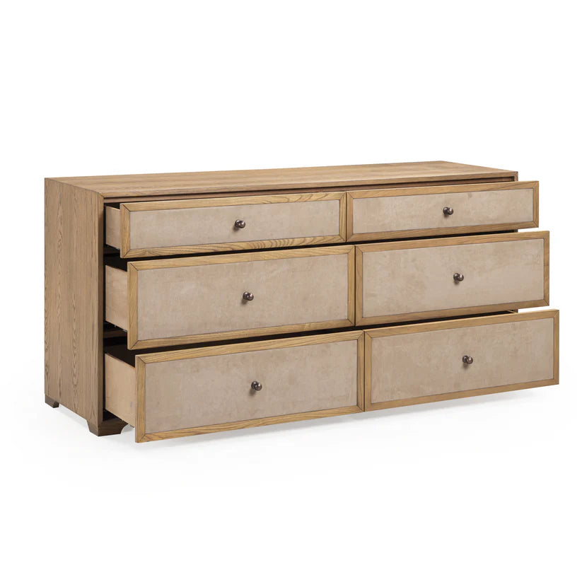 The Chaussée Dresser in light taupe suede and natural wood merges understated elegance with practical design. Its warm wood frame paired with softly textured taupe suede drawer fronts creates a subtle, sophisticated contrast. Six smooth, soft-close drawers provide effortless storage, while the velvet-lined top drawer adds a refined touch for delicate essentials. Ideal for bedside styling, Chaussée brings both luxury and everyday ease to your bedroom retreat.