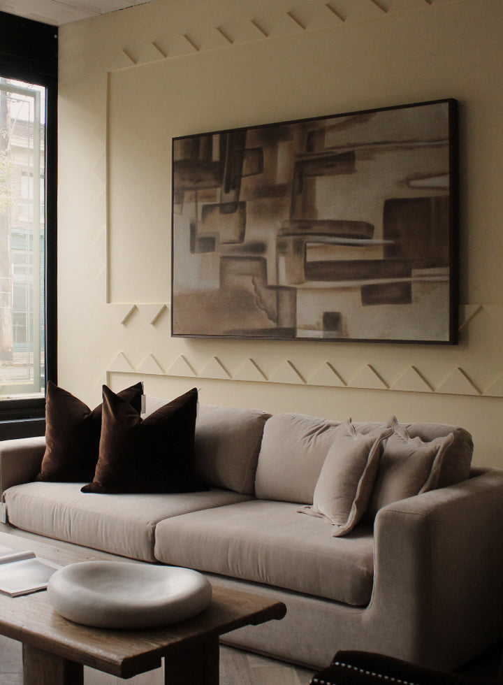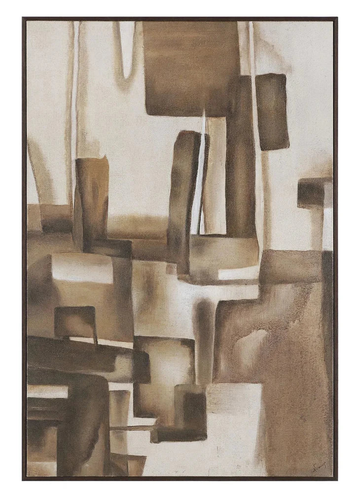 A masterclass in transparency and layered texture, this abstract painting evokes a collage-like aesthetic through carefully applied paint and tactile detailing. Hand-painted on premium linen, its warm brown tones bring a sense of comfort and depth to any interior. Encased in a sleek oak frame, it delivers instant gallery-ready sophistication—no framing required—making it a striking, high-end statement for the discerning collector.