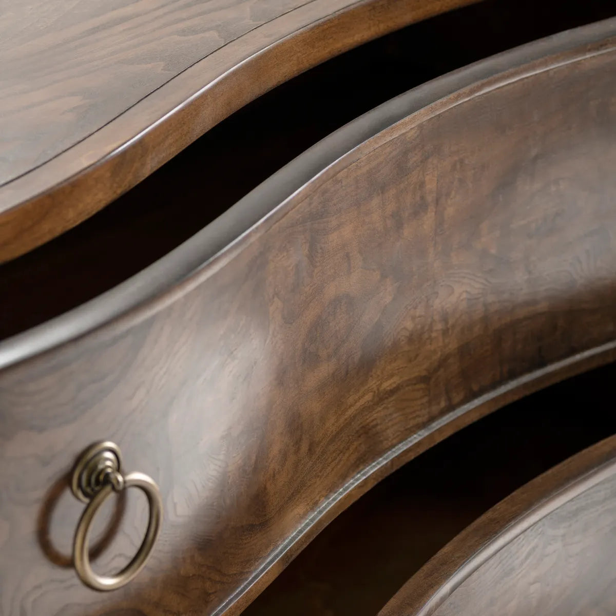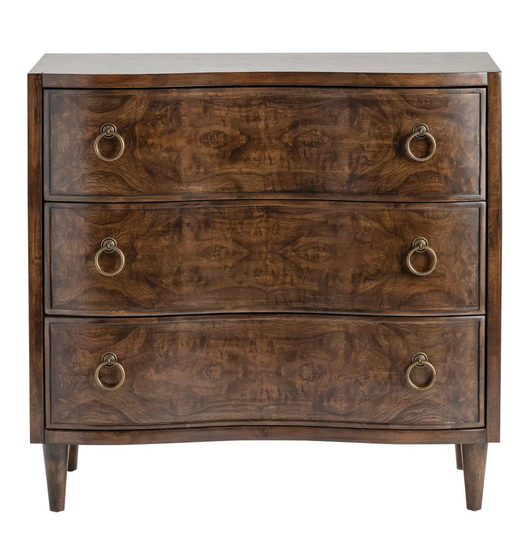 Its gently bowed drawer fronts showcase the mesmerizing depth and movement of olive ash burl, creating a rich, organic pattern that feels both luxurious and refined. Brass ring pulls offer a subtle vintage touch, perfectly complementing the warm, lustrous finish.