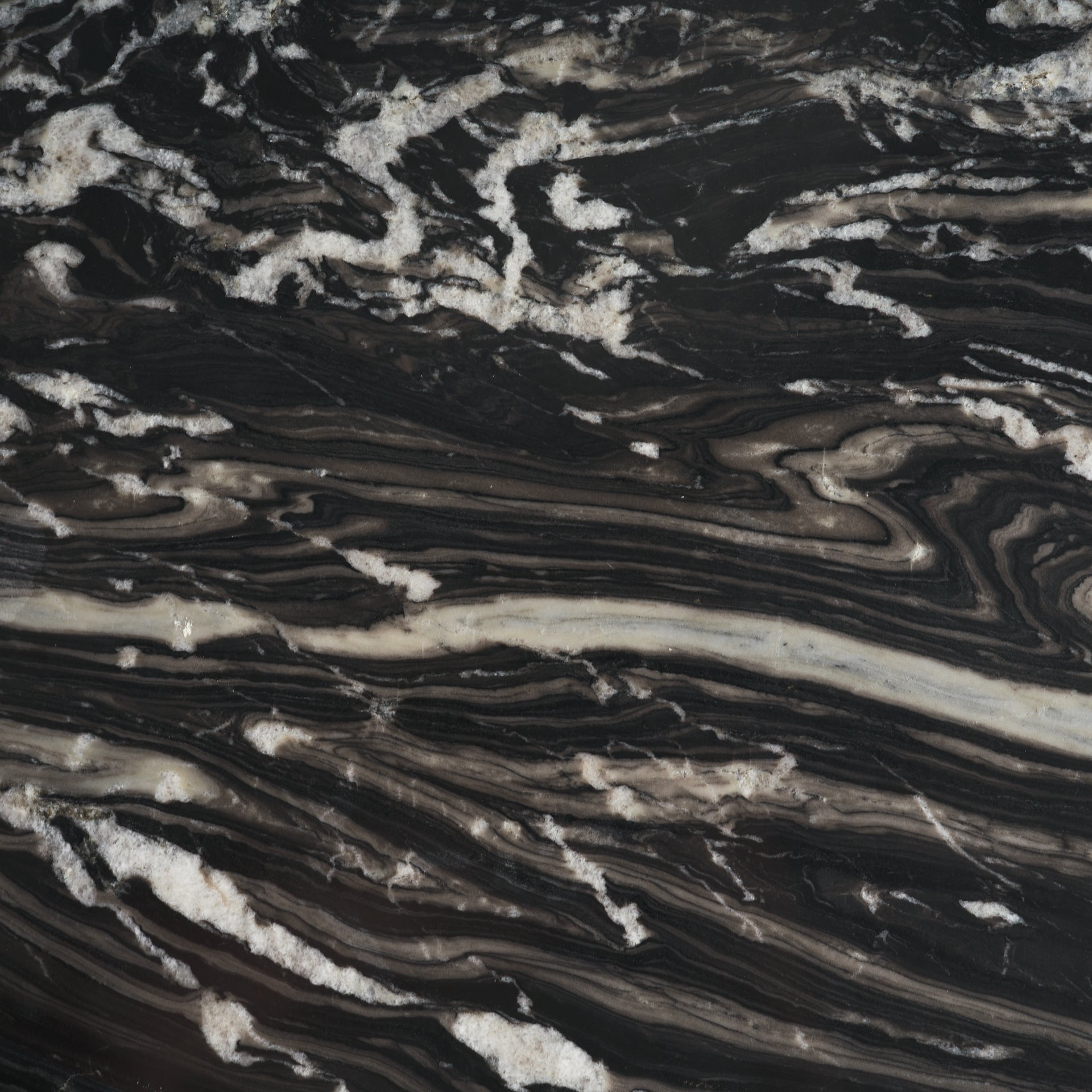 The round tabletop features a unique, high-cntrast black forest marble and matte black wooden base