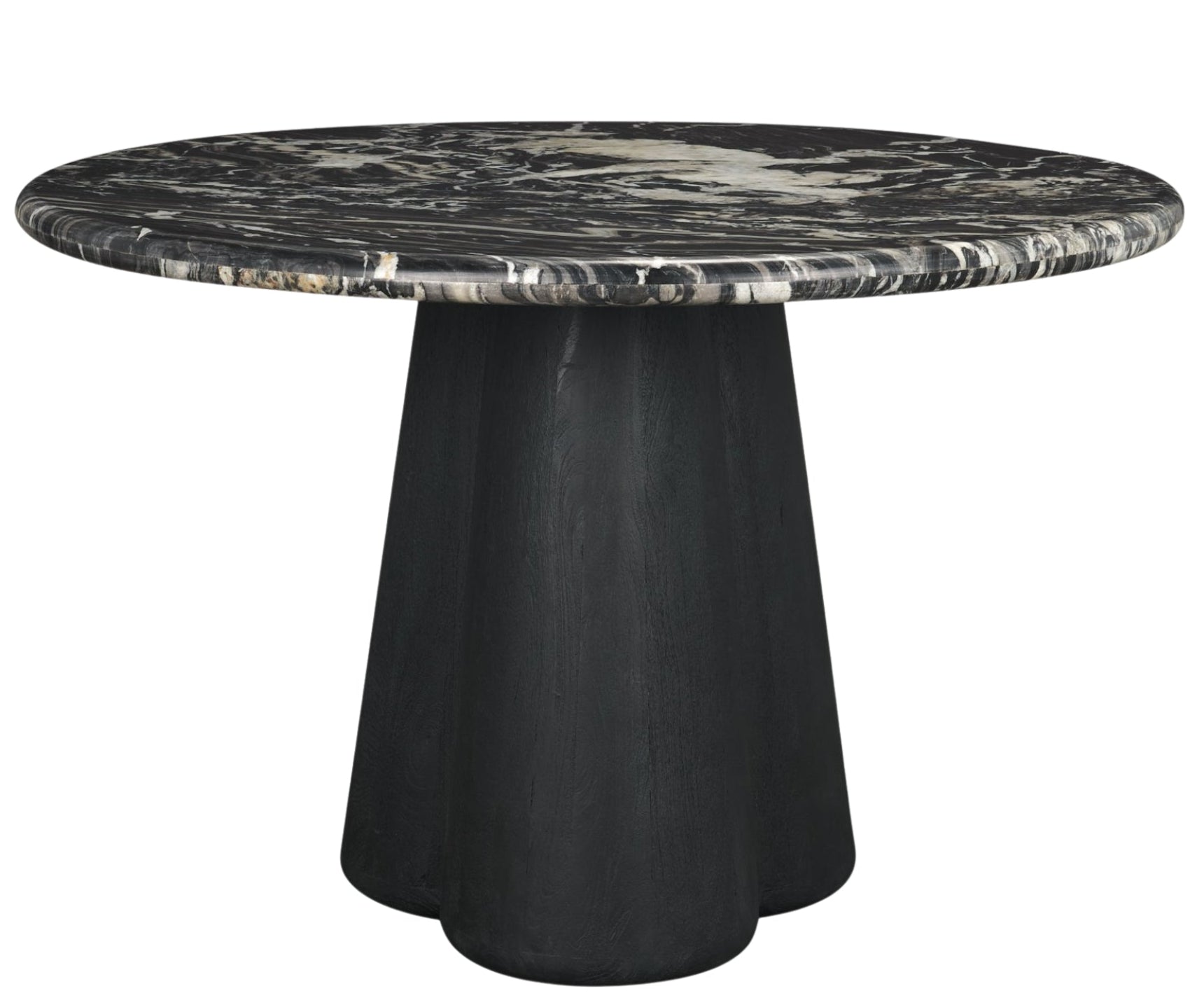 The Ostras Dining Table is a contemporary statement piece, showcasing a striking black forest marble top with bold natural veining. Its distinctive clover-leaf pedestal base adds sculptural balance, creating a refined centerpiece that elevates any dining space.