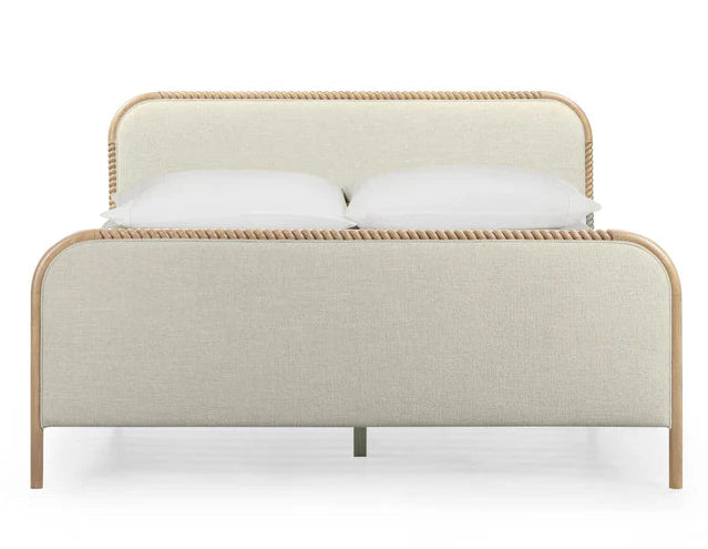 The Sablon Bed in basketweave upholstery combines comfort with artisanal detail, bringing a warm, inviting presence to any bedroom. Its upholstered headboard and footboard are elegantly framed with turned spindle-style wood, offering a tactile contrast that is both cozy and refined. Offered in king and queen sizes.