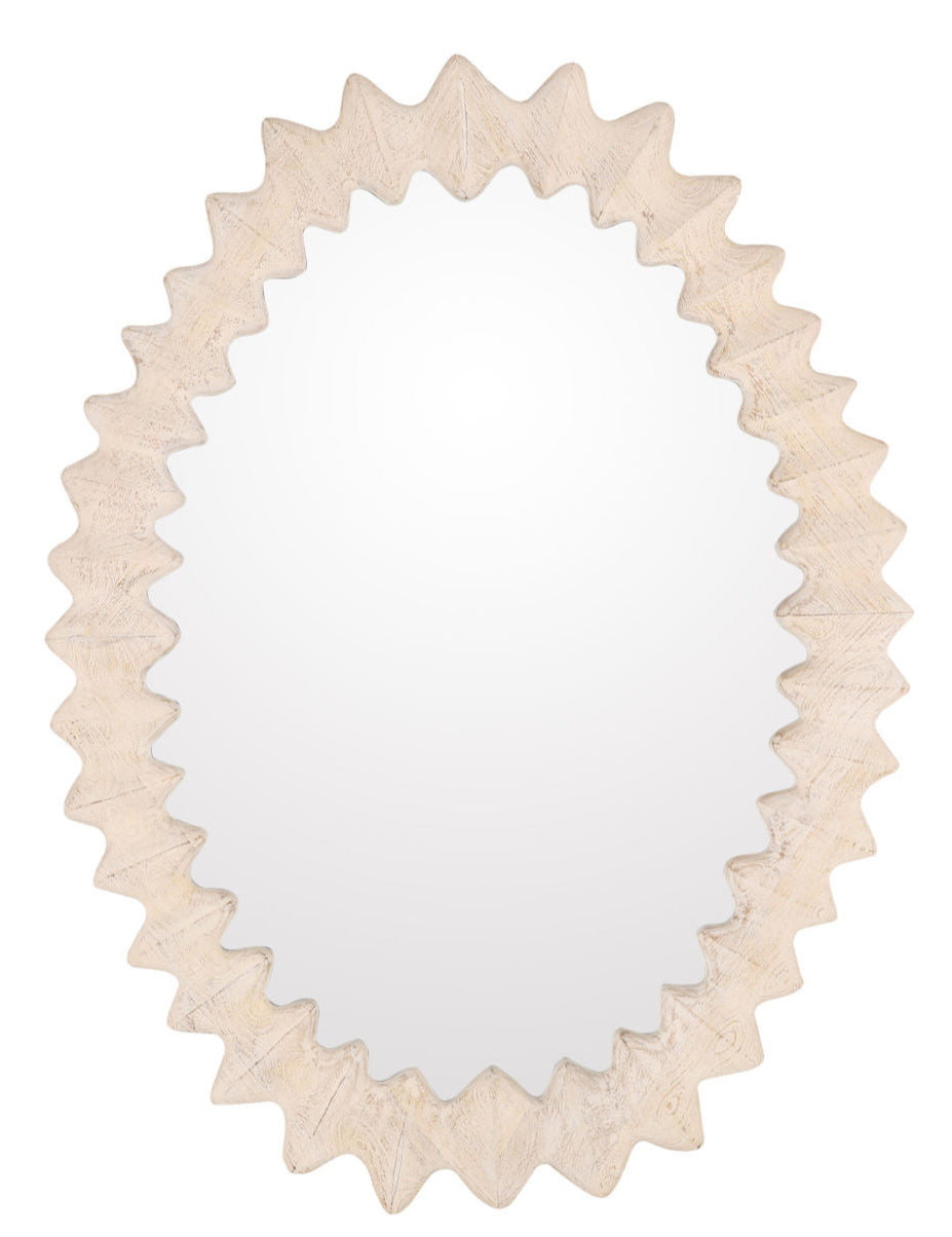 Crafted from whitewashed mango wood, this mirror features primitive, carved spiked detailing for a striking, textural effect. Its artisanal character and sculptural silhouette make it a bold focal point in any space, blending rustic charm with contemporary appeal.