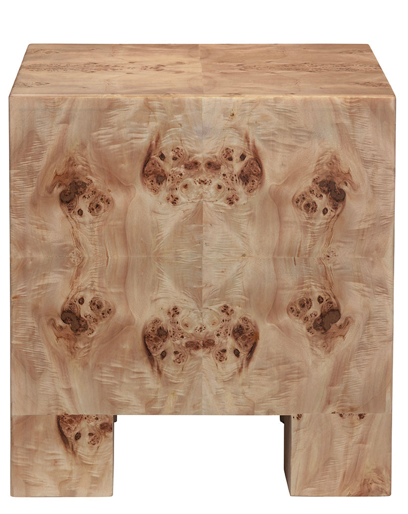 Striking in its simplicity, this cube side table showcases the rich character of burl wood with a bold, block-like silhouette. The lacquered surface highlights the swirling organic grain, lending depth and individuality to every piece. Resting on subtle feet that elevate its form, the table balances weight and refinement—serving equally well as a functional accent or sculptural statement in any room.