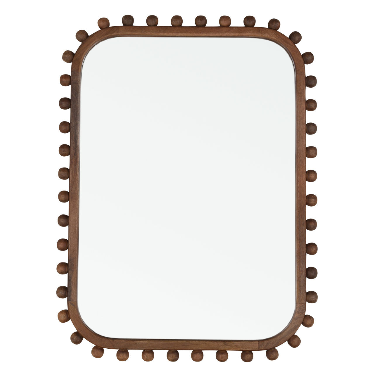 This wooden mirror features a sculptural frame composed of graphic spherical elements, creating a bold, eye-catching statement. Its artistic design adds texture and dimension, making it a striking focal point for any contemporary interior.